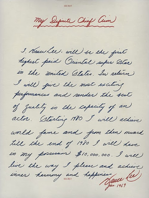 I, Bruce Lee, will be the first highest paid Oriental super star in the United States. In return I will give the most exciting performances and render the best of quality in the capacity of an actor. Starting 1970 I will achieve world fame and from then onward till the end of 1980 I will have in my possession $10,000,000. I will live the way I please and achieve inner harmony and happiness.